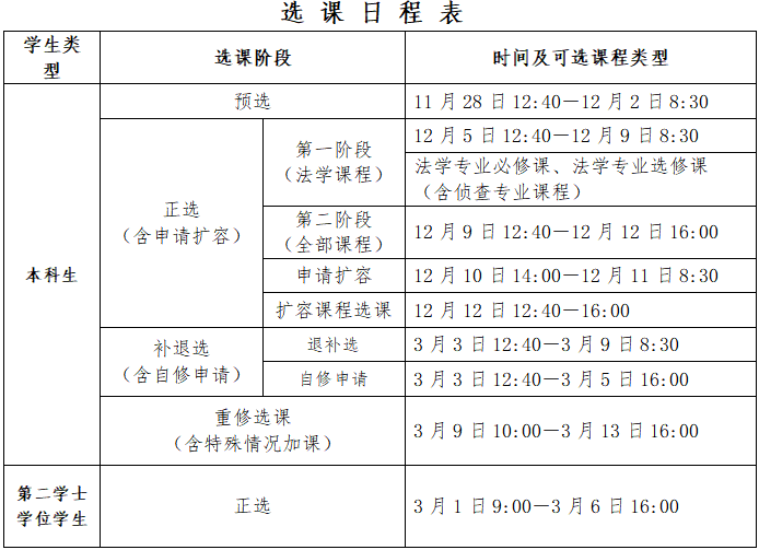 第一阶段【法学课程】:第十四周周五(12月5日)12:40——第十五周周二(12月9日)8:30,法学专业课可退可选(含侦查专业课程),其他课程只退不选。本阶段开启退课保护,教务处将于每天12:20(除12月5日外)发布前24小时因退课而释放的课容量,学生同时进行选课。12月9日8:30结束后再次释放课容。