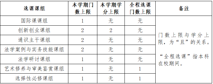 (三)选课制度与政策参见《中国政法大学本科学分制管理办法》、《中国政法大学本科生选课管理办法》。学生应于选课前仔细阅读选课制度政策、本通知及个人培养方案,对本次选课课程进行科学合理规划。